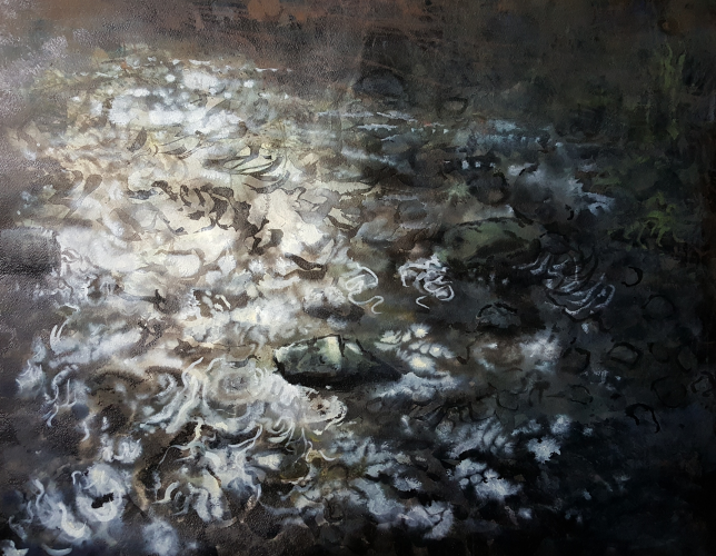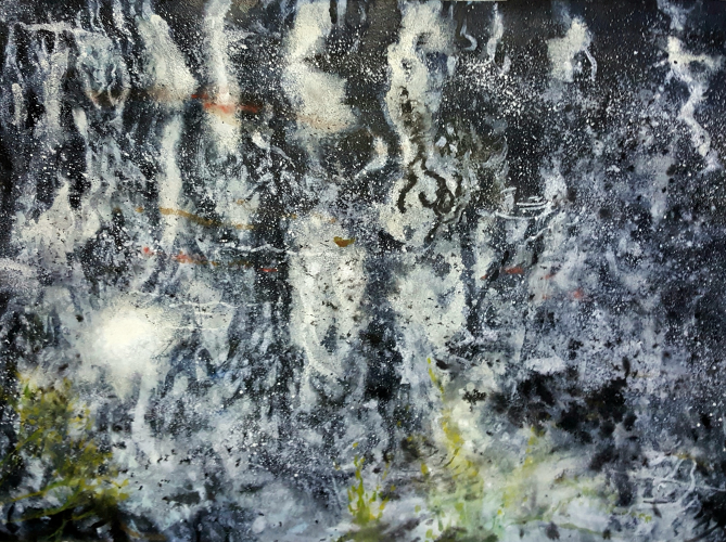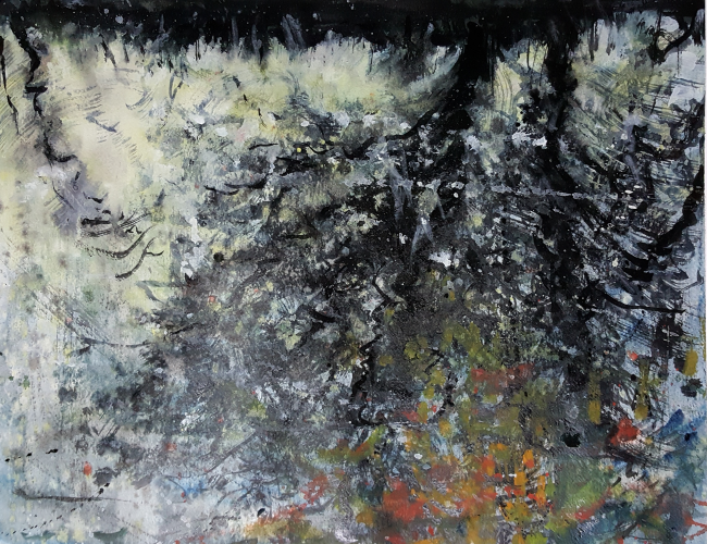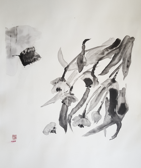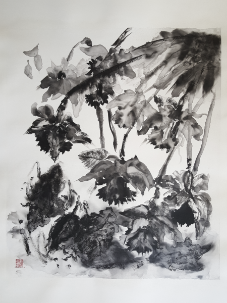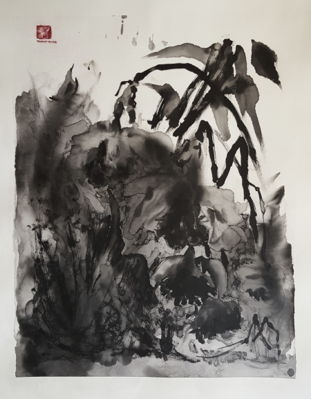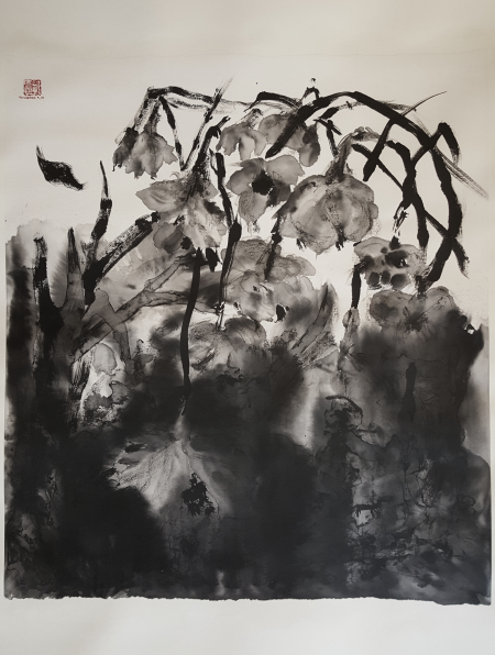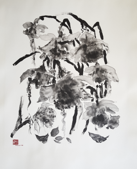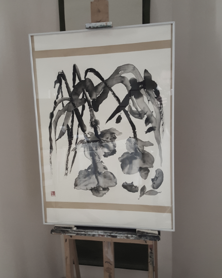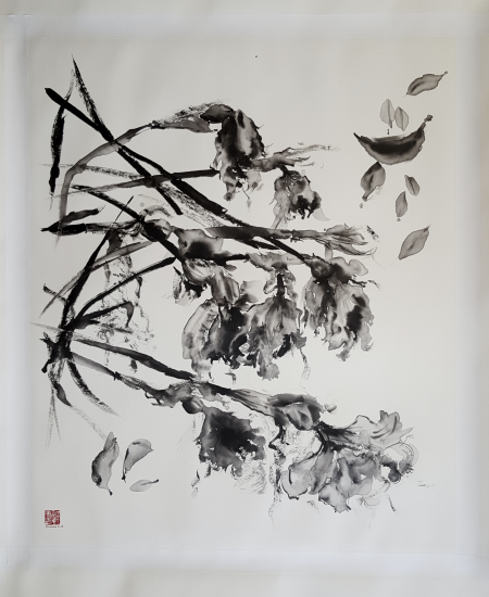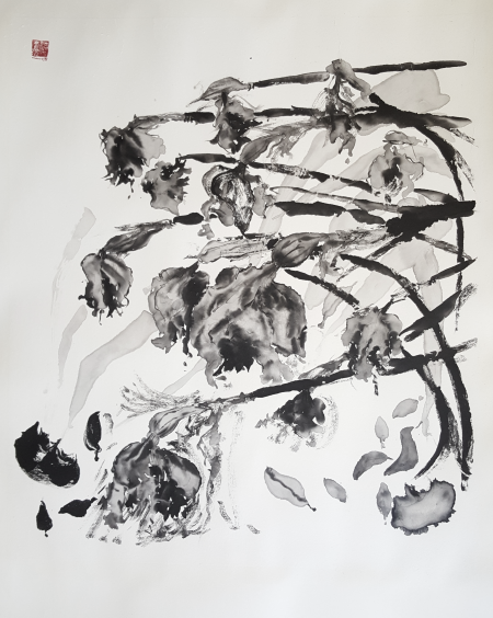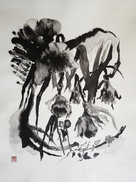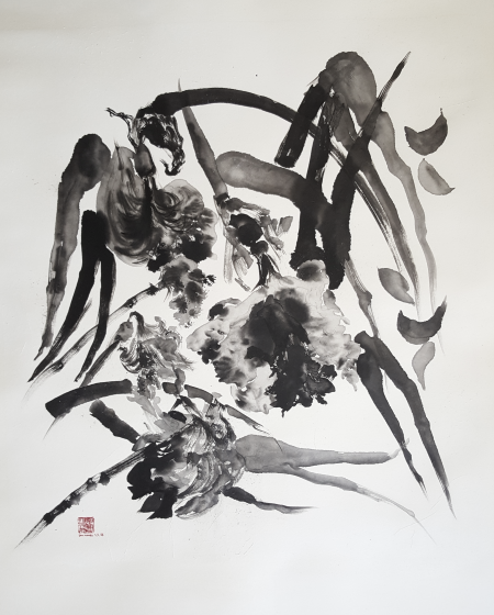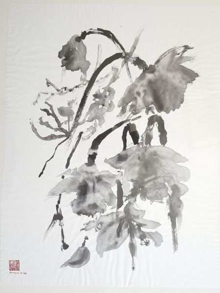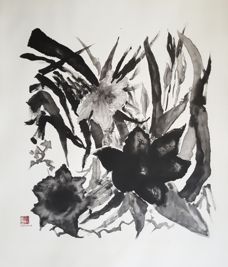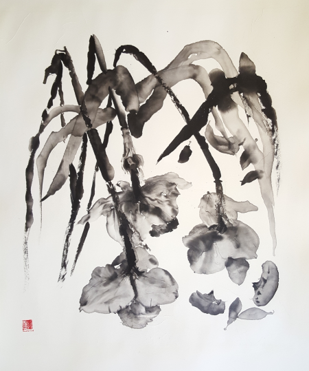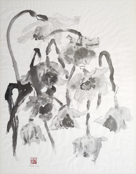 études d'encre sur papier de calligraphie durant une saison avec les jonquilles. Très grands formats marouflés.